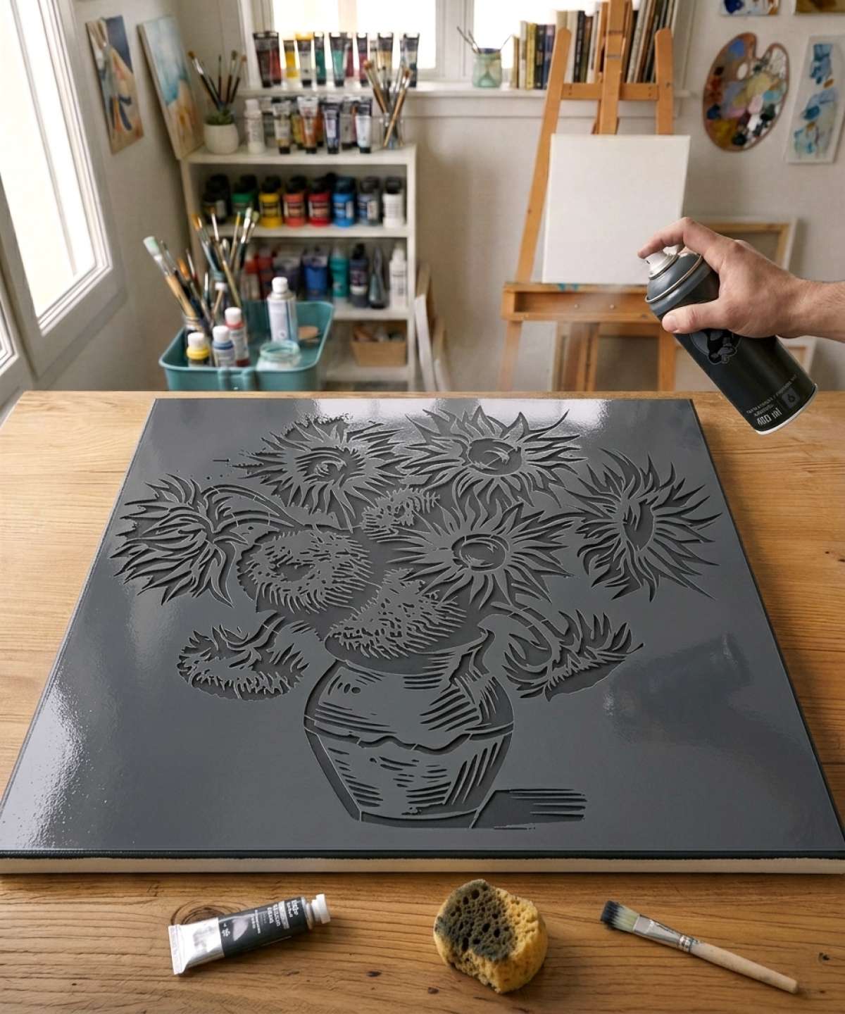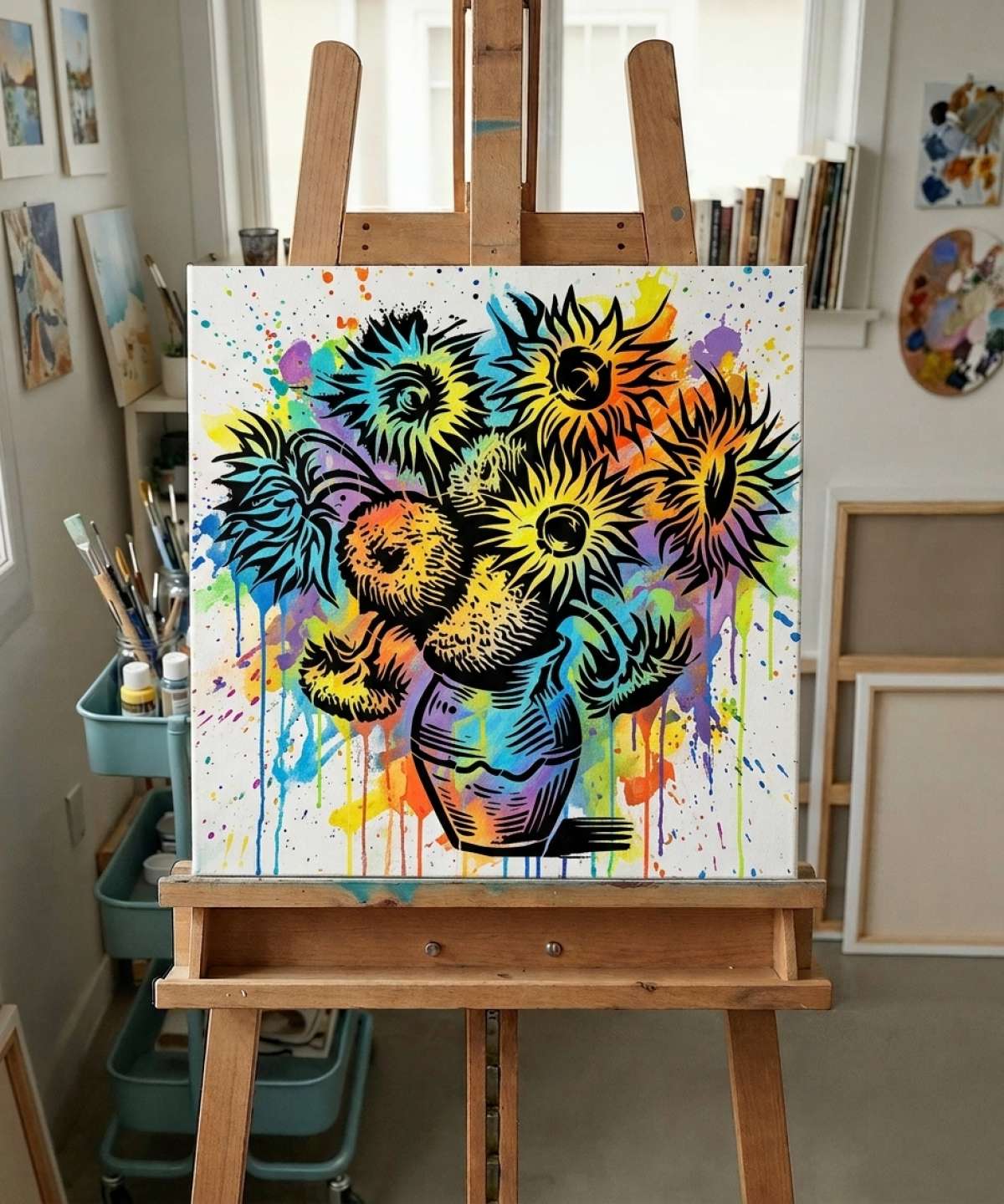 Eine Street-Art-Interpretation von Van Goghs Sonnenblumen. Ein ikonisches Motiv, das die Graffiti- und Urban-Art-Codes aufnimmt. Ideal, um sofortige Wirkung zu erzielen.