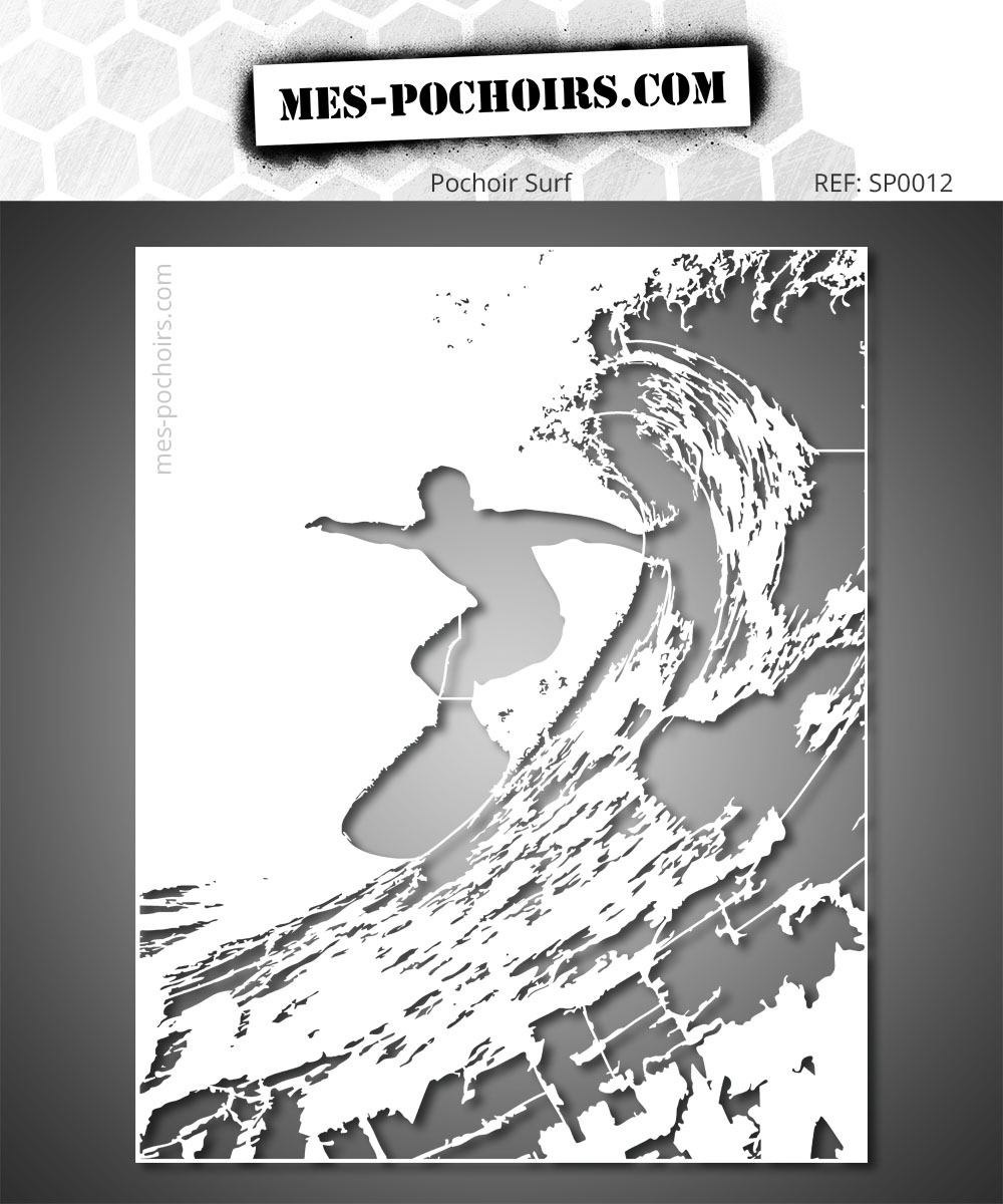 This stencil portrays a surfer in motion, capturing the raw energy of a powerful wave. The surfer's silhouette stands out amid swirling foam, creating a dynamic and striking sense of movement.When used in a composition, this stencil conveys a feeling of fluidity and strength. Its detailed cut allows for a faithful reproduction of the water's movement and the surfer's stance, helping you to inject a burst of energy into your artistic projects.