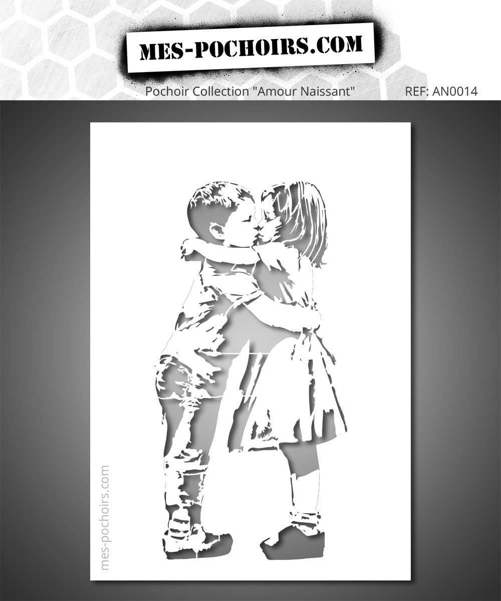 Ce pochoir met en scène deux enfants s’enlaçant et s’embrassant avec douceur, dans un geste plein d’émotion et de sincérité. La composition, à la fois simple et expressive, capte la pureté de l’amour enfantin – un moment suspendu, sincère et universel. Les silhouettes se détachent avec force, révélant toute la délicatesse du geste et la complicité naturelle entre les deux personnages. Le contraste saisissant confère à l’image une intensité émotionnelle qui la rend immédiatement reconnaissable et touchante..
