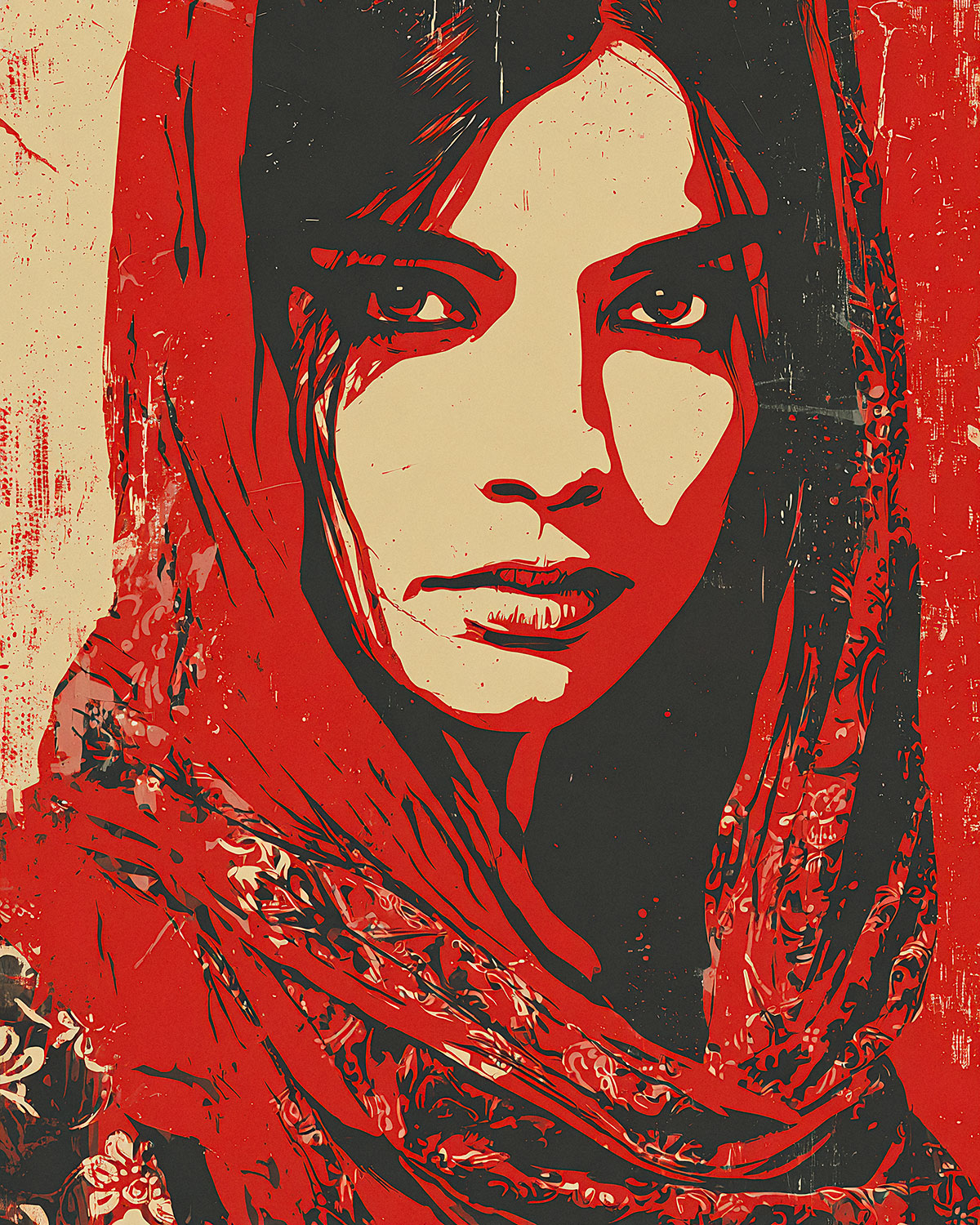 Ce pochoir visage féminin met en scène une femme enveloppée dans un voile dont les plis et les ombres semblent se fondre dans le fond, créant un jeu subtil entre présence et effacement. Son regard, à la fois direct et apaisé, capte immédiatement l’attention. Il émane de ce visage de femme voilée une force silencieuse, une expression de calme assurance, presque méditative. L’ensemble évoque une figure intemporelle — à la croisée de la douceur et de la détermination.Le dessin se distingue par la finesse de son tracé et la précision de ses découpes. Les lignes du visage sont nettes, épurées, tandis que le drapé du tissu offre un contraste riche en textures, avec des effets de matière qui rappellent la lumière sur un tissu usé ou froissé. Cette alternance entre zones pleines et détails délicats donne au pochoir une grande profondeur visuelle et un rendu particulièrement vivant une fois appliqué.